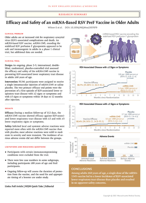 A single dose of the mRNA-1345 vaccine resulted in no evident safety concerns and led to a lower incidence of RSV-associated lower respiratory tract disease and of RSV-associated acute respiratory disease than placebo among adults 60 years of age or older. (Funded by Moderna; ConquerRSV ClinicalTrials.gov number, NCT05127434. opens in new tab.)